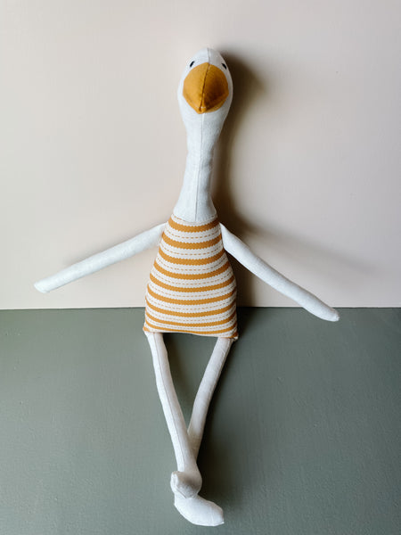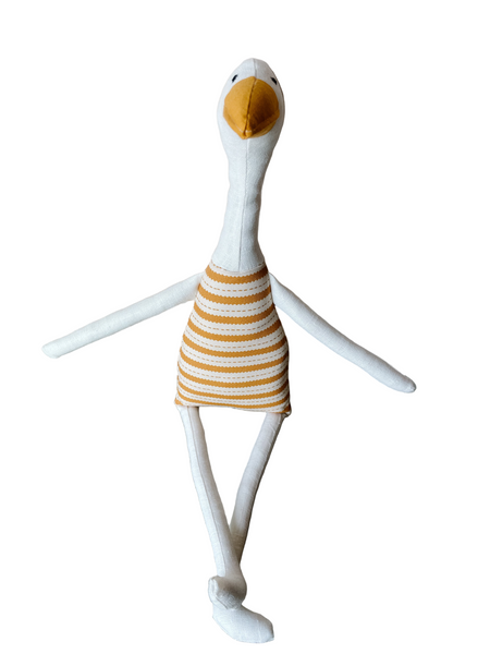 Cotton /Linen fabrics with Poly filling. Goose is made of 100% linen, with a linen body, perfect for hugs and garden adventures.