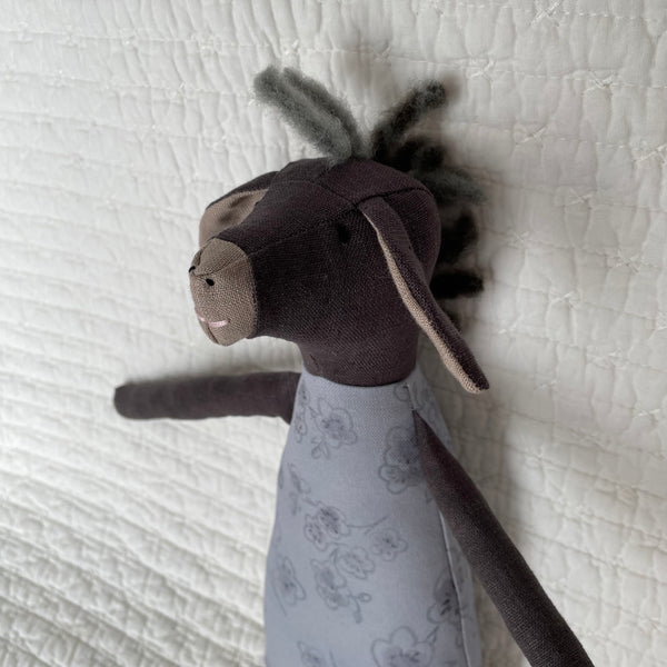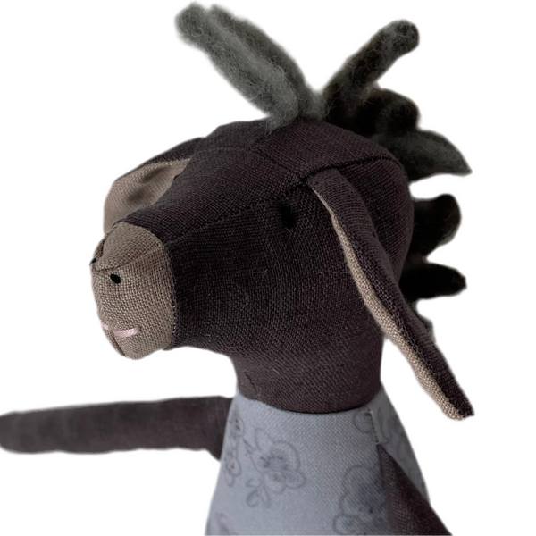 Cotton /Linen fabrics with Poly filling. Donkey is made of 100% linen, with a linen body, and Mohair blend hair perfect for hugs and garden adventures.