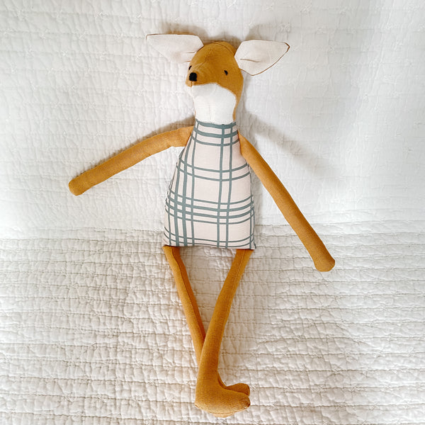 18” Honey Fox with plaid print belly. Hand stitched face.