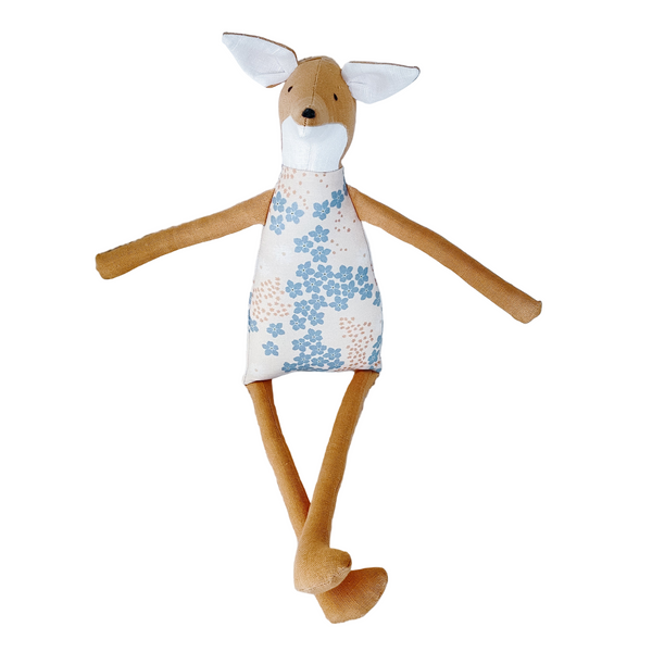 18” Honey Fox with forget-me-not flower print belly. Hand stitched face.