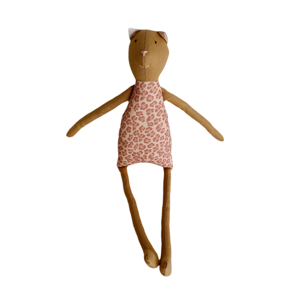 18” Honey linen Cat with pink and peach Leopard print belly. Hand stitched face.