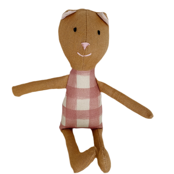Cotton /Linen fabrics with Poly filling. Gingham Cat is made of 100% linen, with a linen body, perfect for hugs and garden adventures.