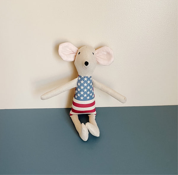 8” Animal with Flag inspired print belly. Hand stitched face.